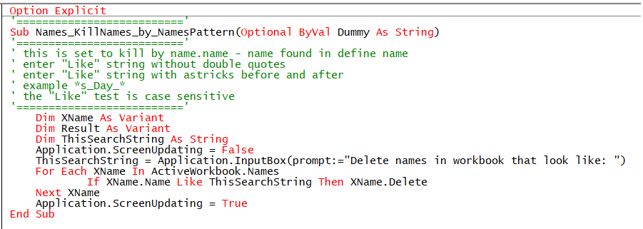 As an aside, I use the following code snippet to selectively delete collections of Range Names.