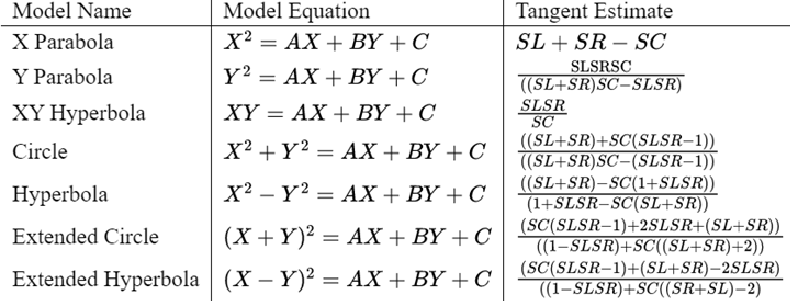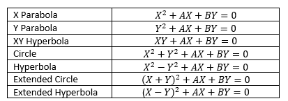 Recognizing that the conic segment models must include the terms to support translation in both the X and Y directions (the slope of the curve is invariant under translation), gives rise to the choice of seven conic segments that can be defined by three points: